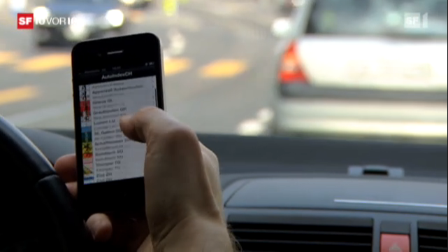 Um den Beitrag aufzupeppen, dass in sieben Kantonen die Abfrage des Halters via Fahrzeugnummer kostenpflichtig wird, sah man einen Autolenker, der während der Fahrt die Autonummer des vorausfahrenden Fahrzeuges in sein Smartphone eintippte.